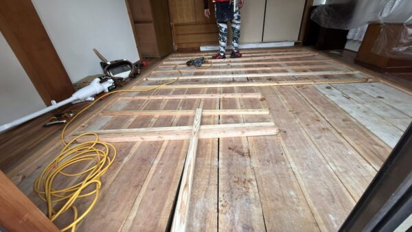 ▼全ての畳を撤去したら、下地工事を行います。下地工事とはフローリング施工のために土台を作る工程です。